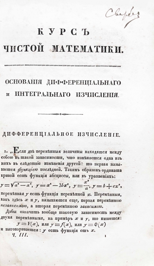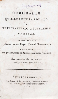 Полное название: Основания дифференциального и интегрального исчисления Бушарля, составляющие третью часть Курса чистой математики, изданного для руководства в Артиллерийском училище. Перевод с французского, с переменами и дополнениями Курс чистой математики.