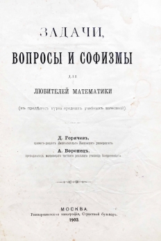Задачи, вопросы и софизмы для любителей математики в пределах курса средних учебных заведений. Книга является сборником интересных задач, которые способствуют развитию интереса к математике в учащихся, дают широкий простор самодеятельности и развивает логическое мышление.