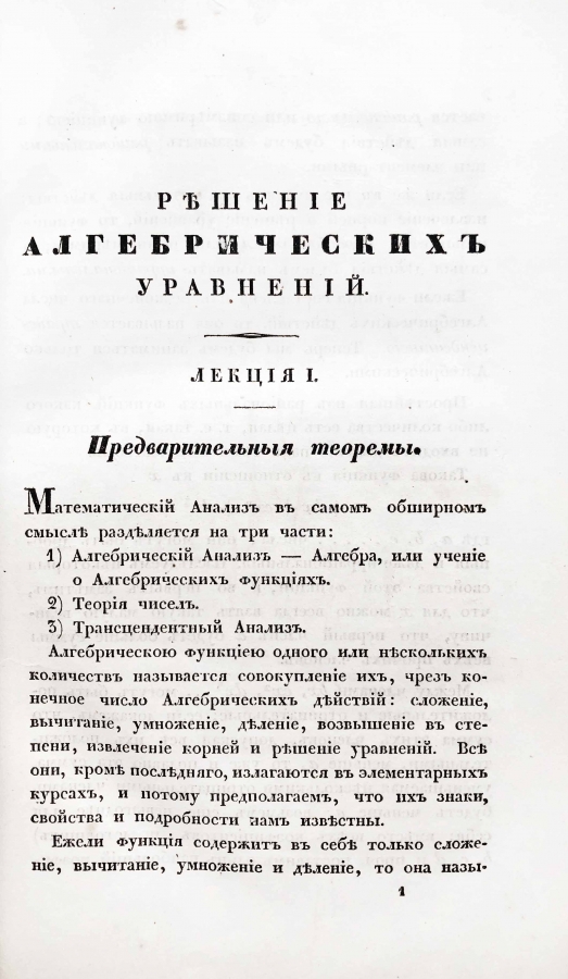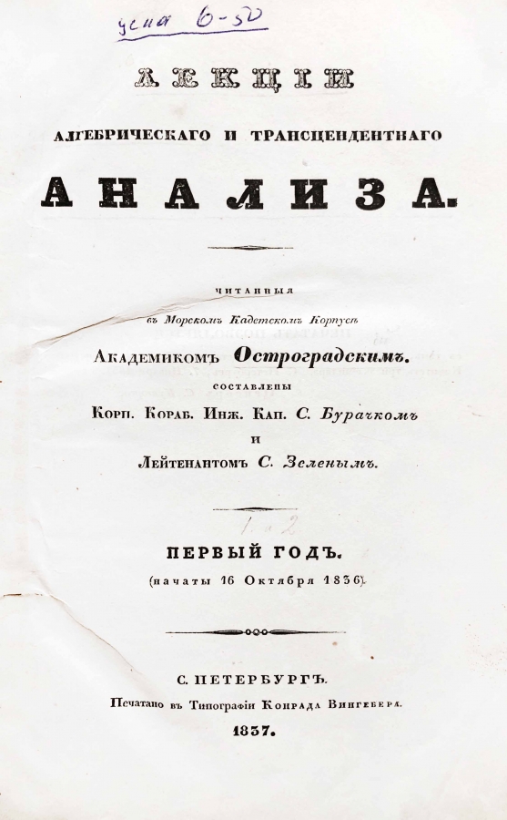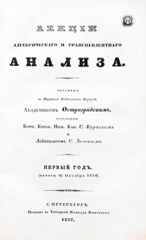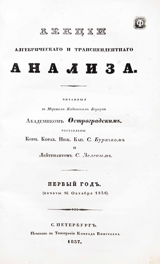Лекции алгебраического и трансцендентного анализа, читанные в Морском кадетском корпусе, в 1836 году академиком Остроградским. Книга составлена С. Бурачком и С. Зеленым.