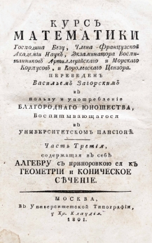 Курс математики господина Безу, члена Французской академии наук, экзаменатора воспитанников Артиллерийского и Морского корпусов, и королевского цензора. Переведен Васильем Загорским в пользу и употребление благородного юношества.