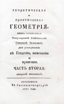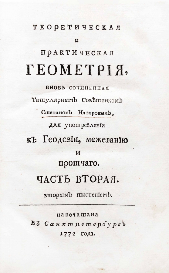 Полное название: Теоретическая и практическая геометрия, вновь сочиненная титулярным советником Степаном Назаровым, для употребления к геодезии, межеванию и прочего.