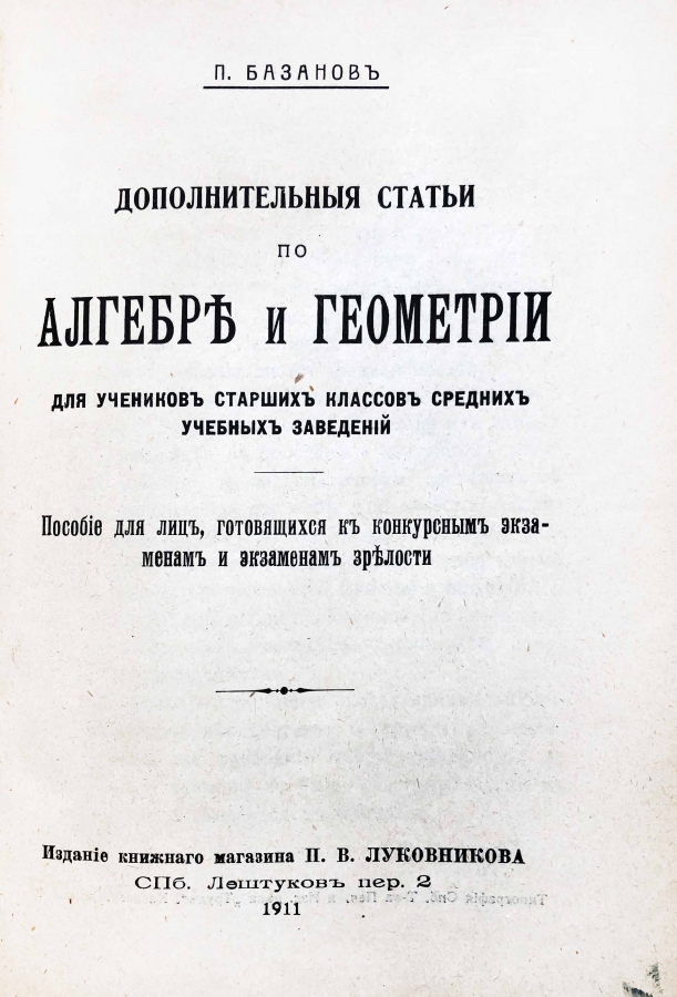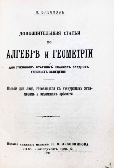 Полное название: Дополнительные статьи по алгебре и геометрии для учеников старших классов средних учебных заведений. Пособие для лиц, готовящихся к конкурсным экзаменам и экзаменам зрелости.
