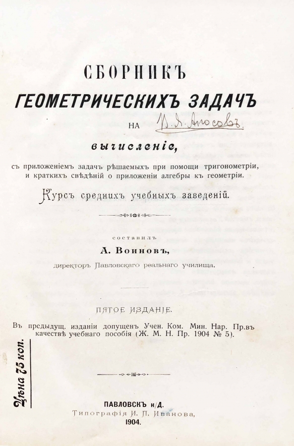 Воинов Александр Данилович (1859-) — действительный статский советник, окончил математический факультет Императорского Харьковского Университета, директор Павловского реального училища в г. Павловск-на-Дону. Издал несколько сборников задач.