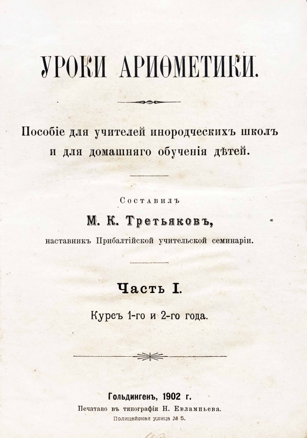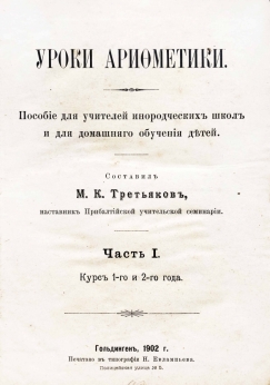 Полное название: Уроки арифметики. Пособие для учителей инородческих школ и для домашнего обучения детей. Курс 1 и 2 года.