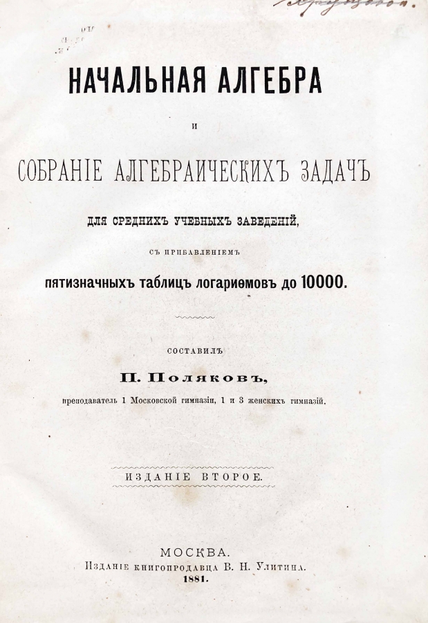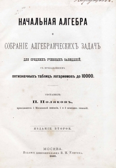 Полное название: Начальная алгебра и собрание алгебраических задач для средних учебных заведений, с прибавлением пятизначных таблиц логарифмов до 10000.