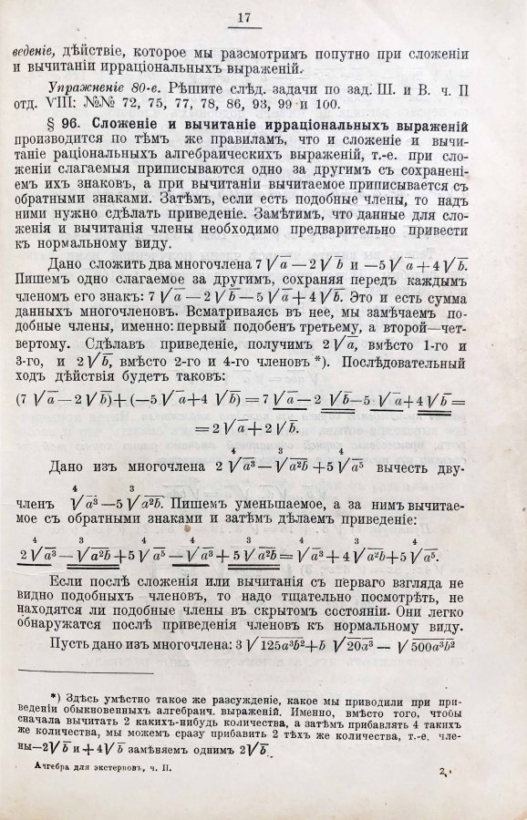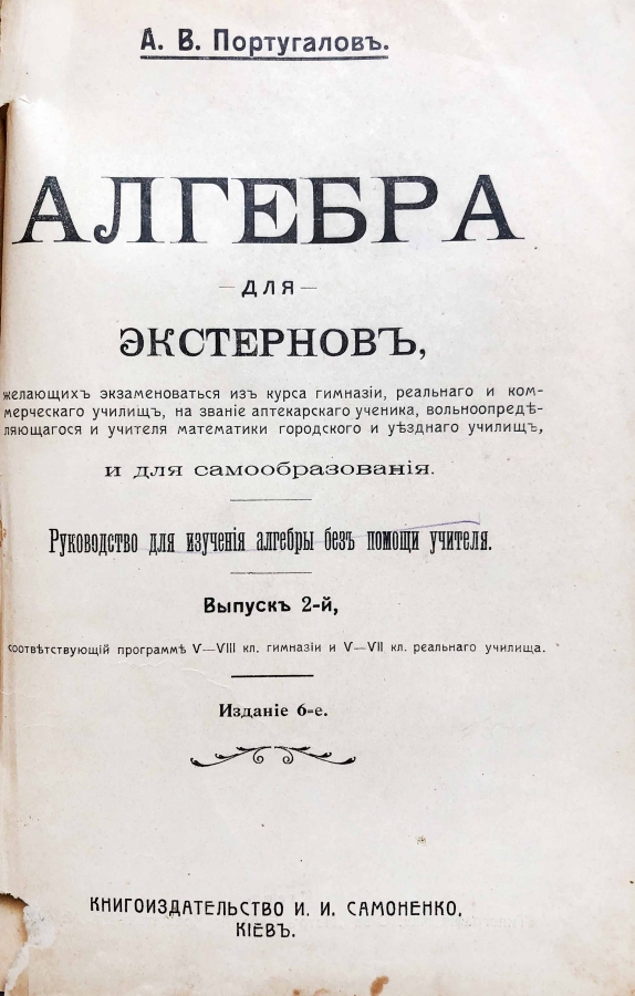 Полное название: Алгебра для экстернов, желающих экзаменоваться из курса гимназии, реального и коммерческого училищ, на звание аптекарского ученика, вольноопределяющегося и учителя математики городского и уездного училищ и для самообразования. Руководство для изучения алгебры без помощи учителя.