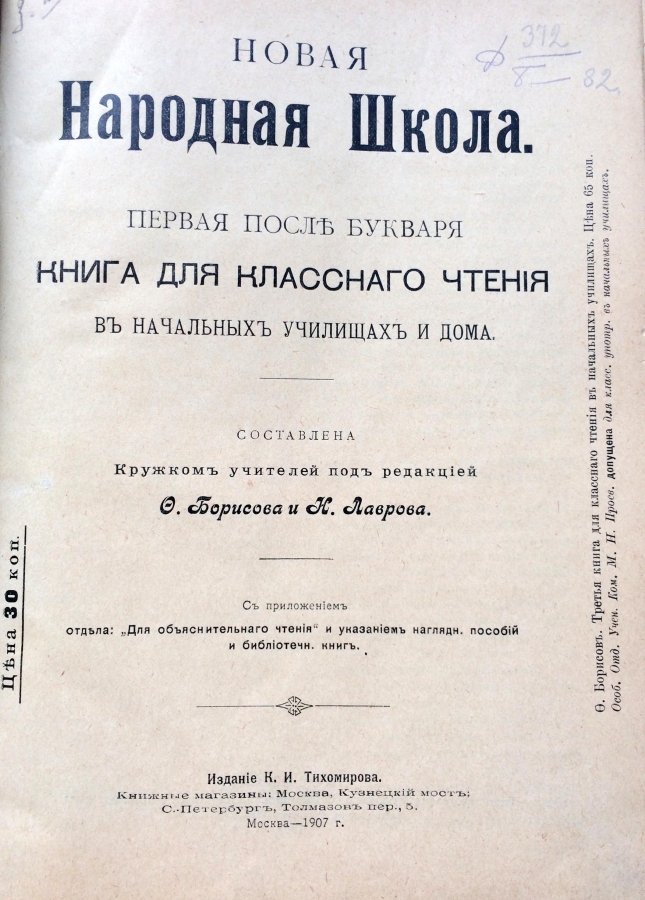 Новая народная школа — первая после букваря книга для классного чтения в начальных училищах и дома, составленная кружком учителей под редакцией Ф.Борисова и Н. Лаврова. Народная школа — важная ступень нравственного и трудового воспитания. Система предоставления учебной информации и методика упражнений обеспечивали развитие мышления учеников, рационализировали сознательное усвоение грамматического строя русского языка и практическое овладение грамотой. Книга представляет историческую и культурную ценность!