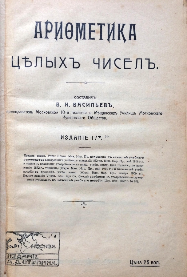 Вниманию читателй предлагается учебник Васильева "Арифметика целых чисел". Во введении освещены общие понятия о числе и об арифметическом действии. Основная часть книги поделены на 2 раздела: действия над числами отвлеченными (сложение, вычитание, умножение, деление, употребление скобок и проч.) и действия над числами именованными (раздробление именованных чисел, превращение, сложение, вычитание, умножение, деление и проч.). Книга представляет историческую и культурную ценность!