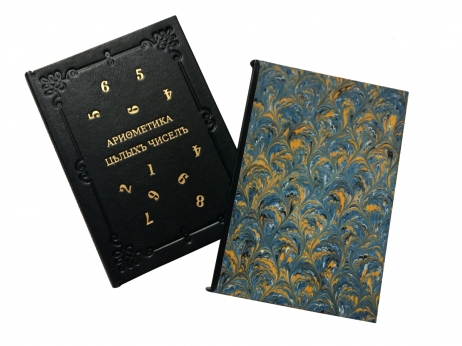 Владельческий переплёт, на крышку переплета наклеен фрагмент оригинальной обложки. Цельнокожанная папка для книги с золотым тиснением. Футляр.