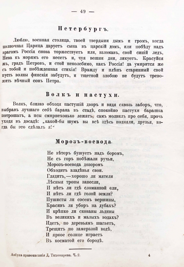 Дмитрий Иванович Тихомиров — российский педагог, общественный деятель, теоретик и организатор начального обучения. В разработке учебной литературы, предназначенной для начальных школ, следовал личному педагогическому опыту и наблюдениям за менявшейся школьной действительностью. Система предоставления учебной информации и методика упражнений обеспечивали развитие мышления учеников, рационализировали сознательное усвоение грамматического строя русского языка и практическое овладение грамотой. Полагал, что народная школа — важная ступень нравственного и трудового воспитания. Подчёркивал необходимость всеобщего начального образования, всесословность школы, необходимость заботы о материально-правовом статусе учителей народных школ.