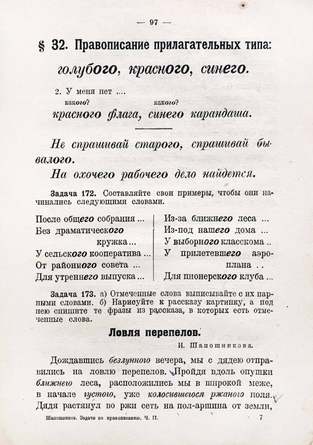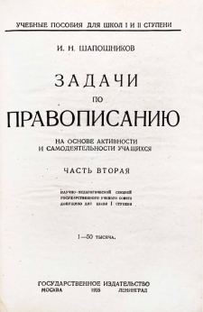 Задачи по правописанию на основе активности и самодеятельности учащихся. Шапошников создал несколько ценных методических пособий для учителей, которые выдержали более 20 изданий. Кроме учебников Шапошников выпустил много цветных наглядных пособий по развитию письменной и устной речи.