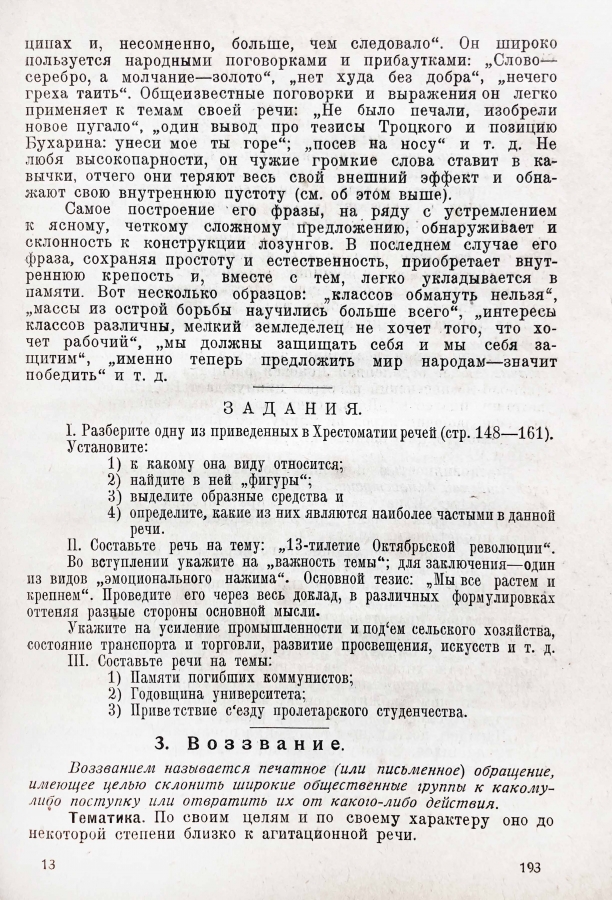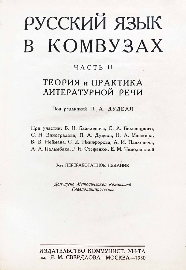 Из предисловия: Русский язык создает основную общеобразовательную базу для всего дальнейшего университетского курса. В то же время и методом, и содержанием своим этот предмет должен содействовать развитию и углублению революционного марксистски-ленинского мировоззрения студентов. И с другой стороны, дать им тот закал языковой культуры, который необходим каждому общественнику-партийцу комвузовского типа в его дальнейшей теоретической и практической работе.