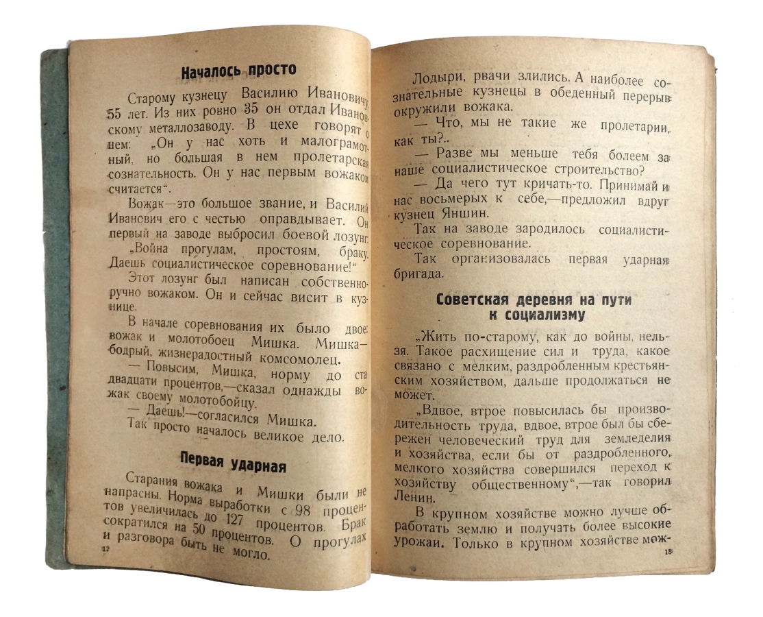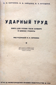Ударный труд — первая книга для чтения после букваря в школах грамоты. В СССР школами грамоты или пунктами грамотности называли одно- или двухгодичные учреждения и школы ликвидации безграмотности (ликбез пункты). Учебник содержит короткие рассказы о жизни и труде в советской деревне. Книга представляет историческую и культурную ценность!