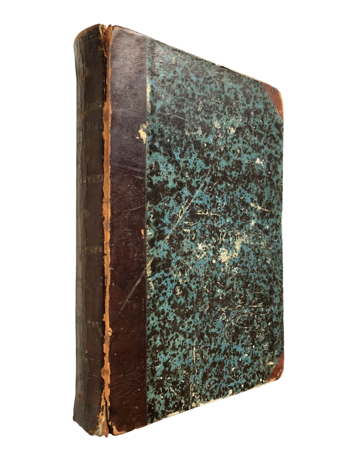 Владельческий полукожаный переплет. Есть потертости на переплёте и корешке. Корешок разорван. Владельческие пометки на форзаце и титуле. Один форзац оторван. Лисьи пятна. Страница 11 выпадает. Увеличенный формат.