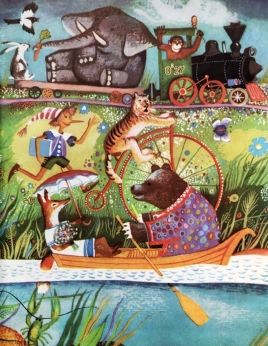 Цветной иллюстрированный издательский картонаж. Есть потертости на переплете. Печать на титуле. Владельческие рисунки на форзацах. Вложена раскладная азбука. Увеличенный формат.