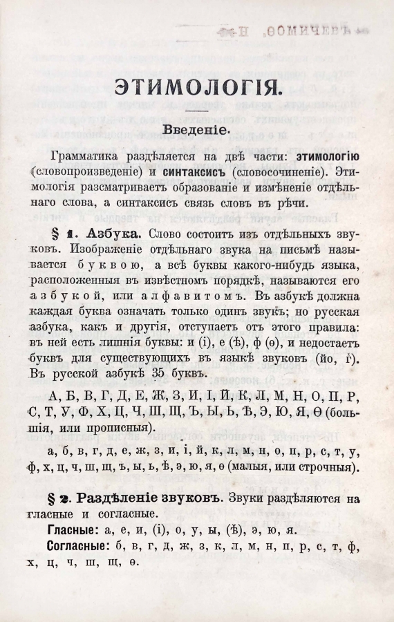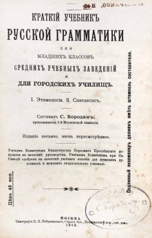 Краткий учебник русской грамматики для младших классов средних учебных заведений и для городских училищ. В учебнике рассматриваются вопросы этимологии и синтаксиса.