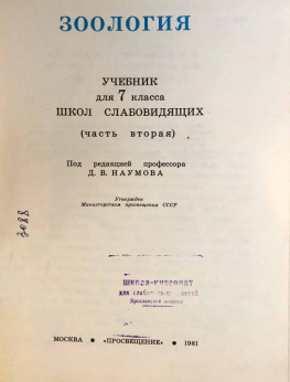 Данный учебник воспроизводит текст 12-го издания учебника «Зоология» для 7-го класса (Быховский Б. Е. и др. Зоология. 6-7 классы. М., Просвещение, 1980). В предлагаемом для школ слабовидящих издании изменены шрифты, формат набора и иллюстрации. Учебник подготовлен к печати научным сотрудником Института дефектологии АПН СССР И. М. Романовой.