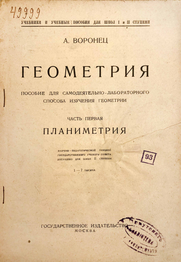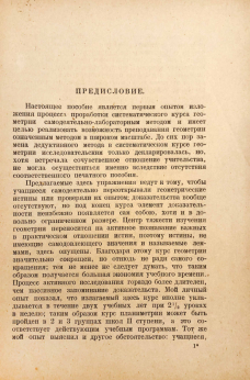 Из предисловия: Настоящее пособие является первым опытом изложения процесса проработки систематического курса геометрии самодеятельно-лабораторным методом и имеет целью реализовать возможность преподавания геометрии обозначенным методом в широком масштабе. Предлагаемые здесь упражнения ведут к тому, чтобы учащиеся самодеятельно переоткрывали геометрические истины или проверяли их опытом; доказательства вообще отсутствуют, но под конец курса элемент доказательности неизбежно появляется сам собою, хотя и в довольно ограниченном размере.