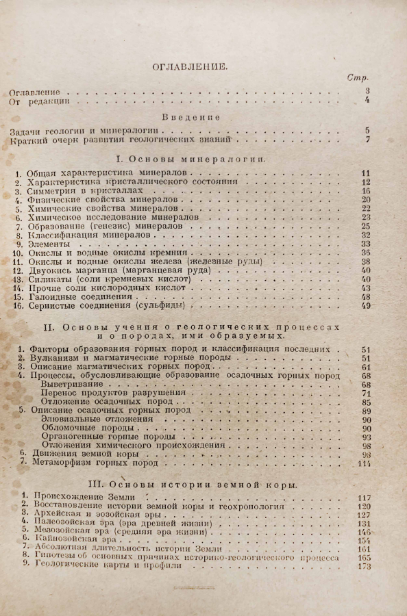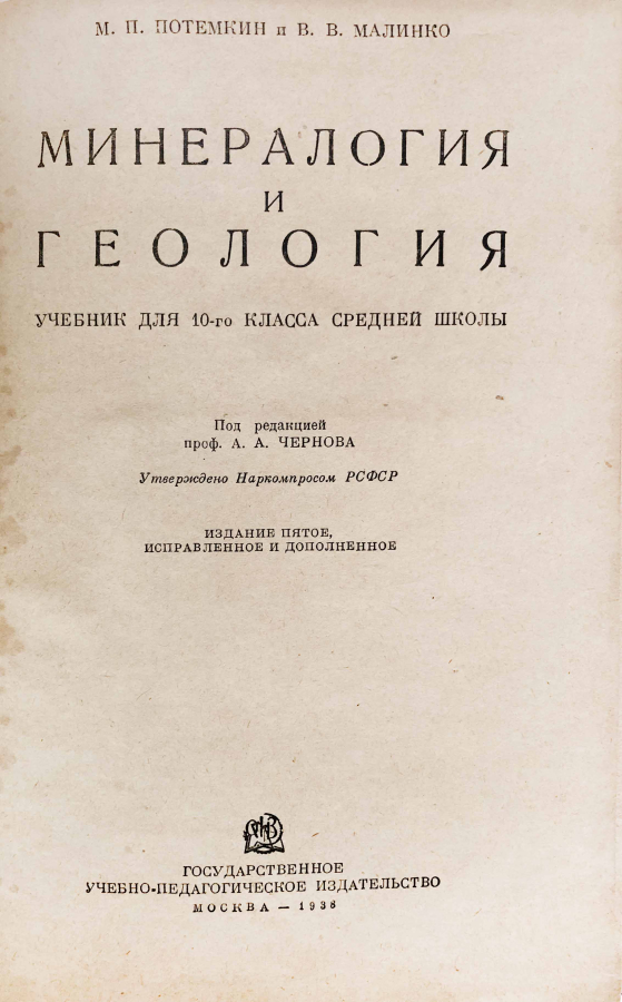 Из предисловия: Пятое издание учебника М.П.Потемкина и В.В.Малинко "Минералогия и геология" не подвергалось коренной переработке и был сдан в свет лишь с самыми необходимыми исправлениями, касающихся явно устарелых мест и небольшого числа чисто научных поправок. Особенно тщательному редактированию подверглись все карты, из которых часть исправлена, а часть заменена другими, более новыми и более точными. Кроме того, во многих местах учебника введен ряд антирелигиозных дополнений, органически увязанных по ходу текста с основным материалом учебника. Вместе с тем некоторые разделы учебника в настоящем издании набраны петитом стой целью, чтобы учитель в случае необходимости при том ограниченном времени, которое отводится для прохождения курса "Минералоги и геология" в 10 классе, мог бы без ущерба их пропустить.
