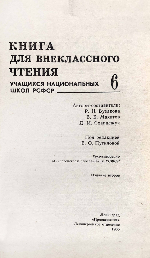 Книга "Книга для внеклассного чтения учащихся национальных школ РСФСР" 6 класс