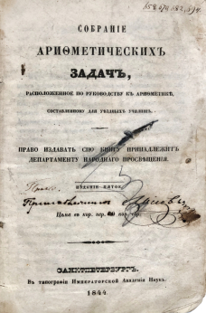 Полное название: Собрание арифметических задач, расположенное по Руководству к арифметике, составленному для уездных училищ.