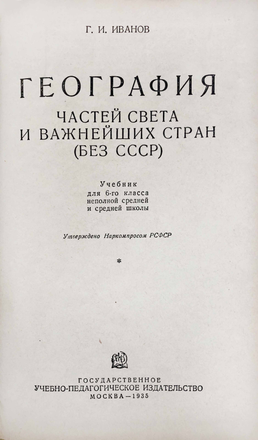 География частей света и важнейших зарубежных стран (без СССР) для 6-го класса неполной средней и средней школы. Разделы учебника: Европа, Азия, Африка, Америка и Австралия.