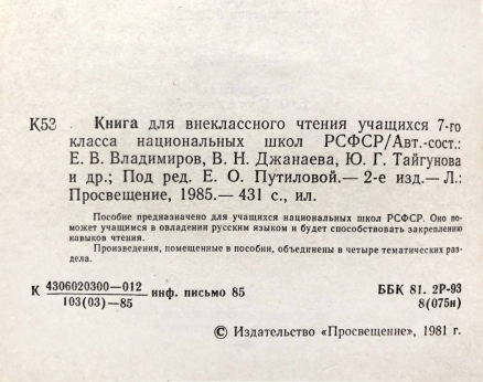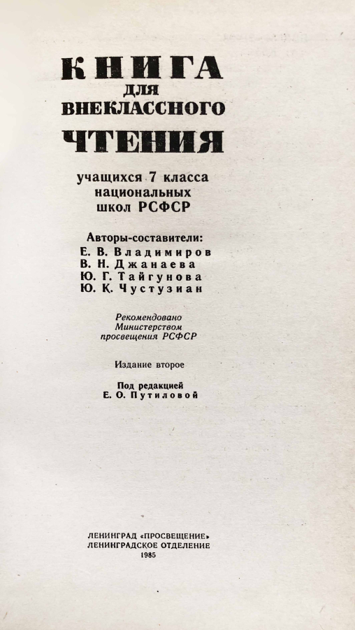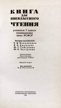 Книга "Книга для внеклассного чтения" учащихся 7-го класса национальных школ РСФСР