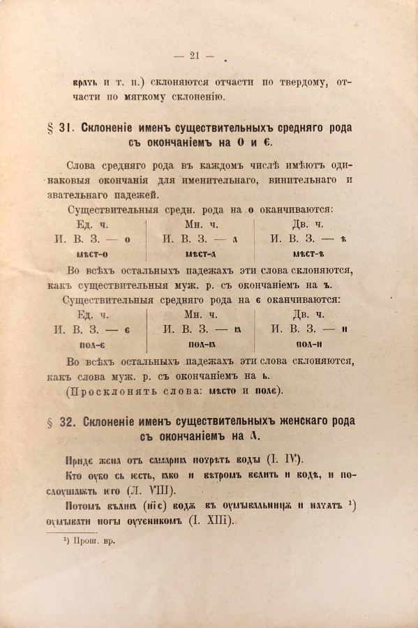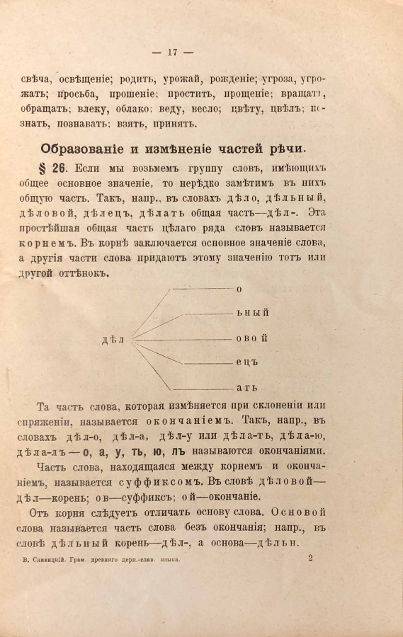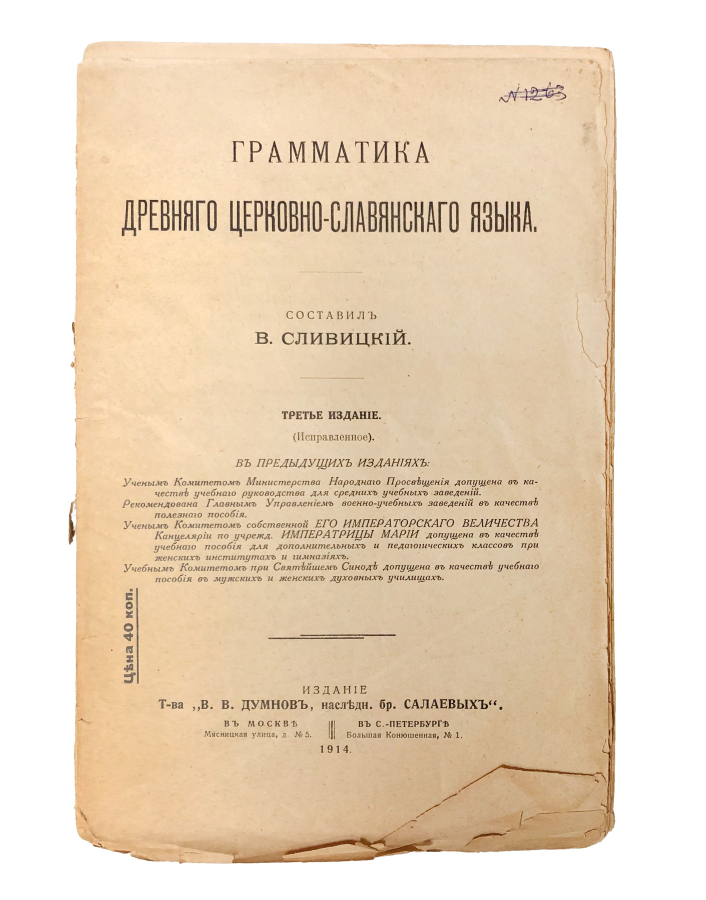 Из предисловия: Грамматику древнего церковнославянского языка следует проходить сравнительно с русской, но при изложении надо избегать постоянных ссылок на формы русского языка, ибо в таких ссылках нет собственно нужды: если ученики знают русскую грамматику, то они и без этих ссылок, загромождающих только текст, легко могут под руководством учителя сопоставить формы русского и древнего церковнославянского языка там, где это, по мнению учителя, является полезным.