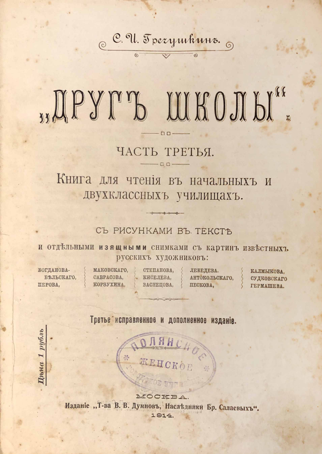 Книга для чтения в начальных и двухклассных училищах. Книга содержит множество текстов на разные темы. С рисунками в тексте и отдельными снимками с картин известных русских художников: Богданова-Бельского, Перова, Саврасова, Васнецова, Лебедева и других.
