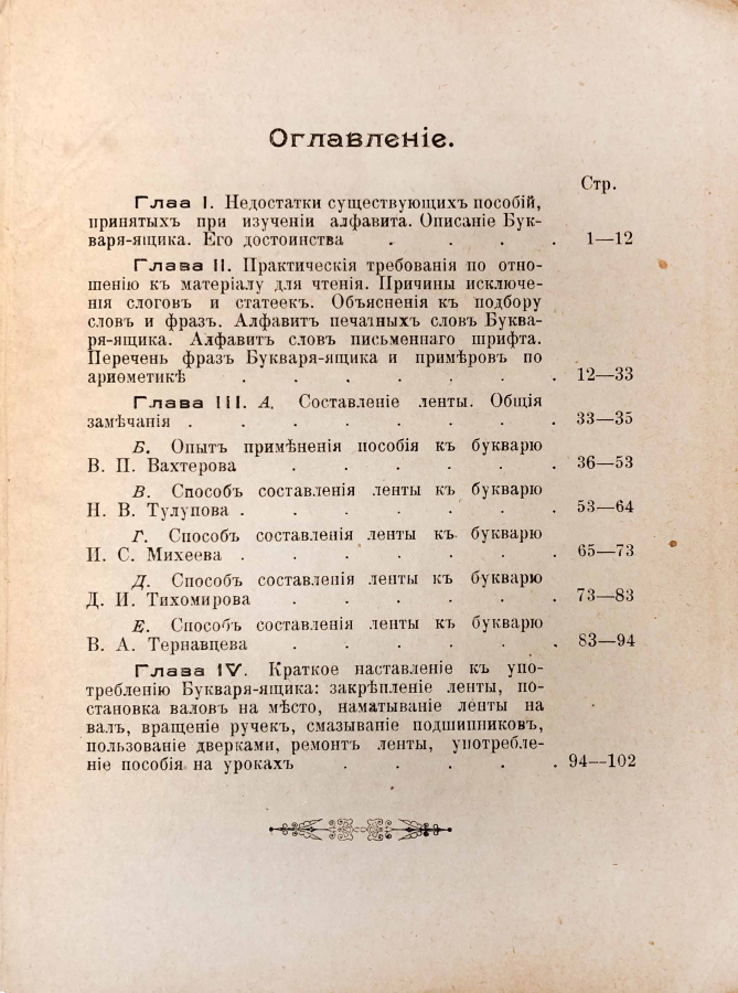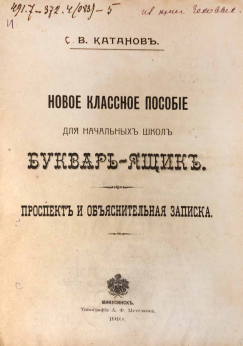 «Букварь-ящик» — интересное и необычное наглядное средство обучения грамоте сочетало в себе свойства технического устройства и печатной книги. Предлагалась автором на замену подвижной азбуке. Это устройство представляет собой ящик с двумя ручками по бокам, дверками и валиками с бумажными лентами внутри. На этих лентах напечатан подбор слов, на другой примеры из арифметики.