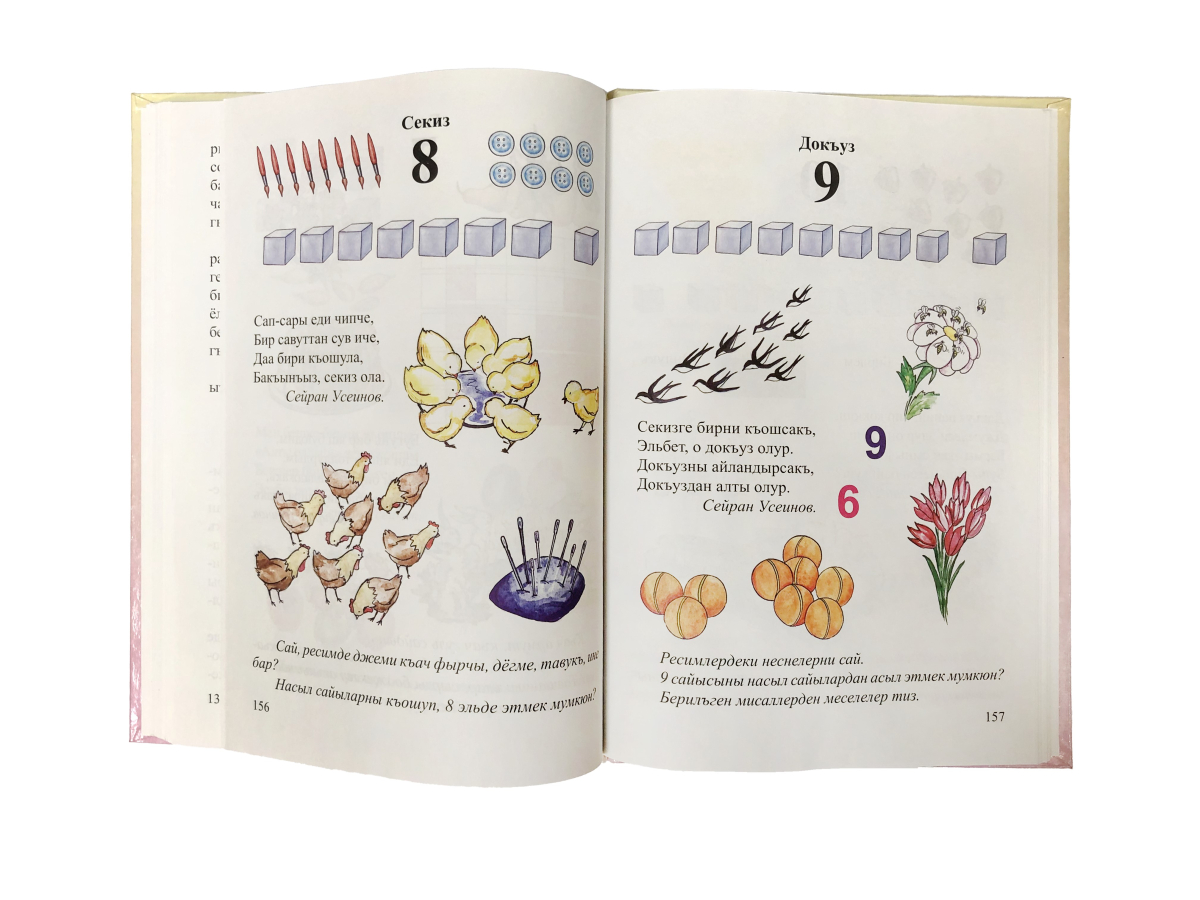 Учебник написан на Къырымтатар тили (самоназвание крымско-татарского языка). Крымско-татарский язык — язык крымских татар, относится к тюркским языкам, входящим в предполагаемую алтайскую семью языков. В настоящее время крымскотатарская письменность функционирует на двух алфавитах — кириллице и латинице.