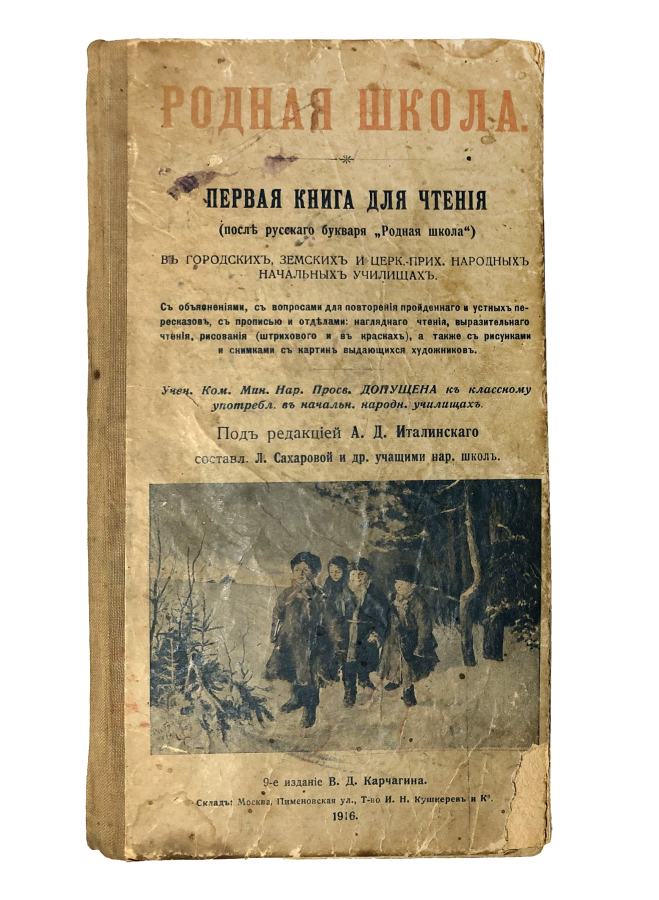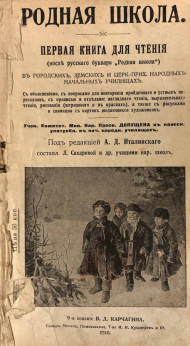 Первая книга для чтения после русского букваря, "Родная школа" для городских, земских и церковно-приходских народных начальных училищ. С объяснениями, вопросами для повторения пройденного и устных пересказов, с прописью и разделами: наглядного чтения, выразительного чтения, рисования (штрихового и в красках), а также с рисунками и снимками с картин выдающихся художников.