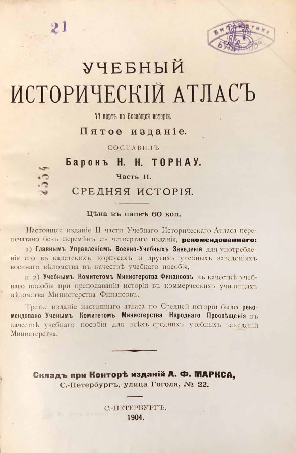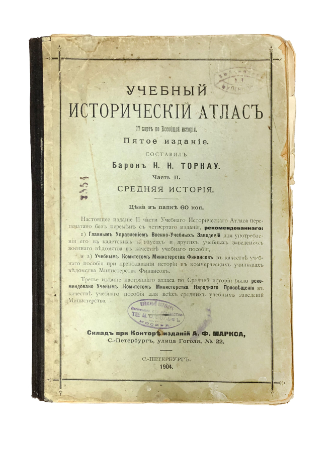 Учебный исторический атлас по истории Торнау, состоящий из 77 карт. Цель учебного исторического атласа — предоставить пособие, соответствующее курсу истории в средних учебных заведениях. Автор руководствовался учебным планом Министерства Народного Просвещения и распространенными учебниками. Для доступности по цене, в редких случаях, использовались маленькие карты со схематическим изображением.