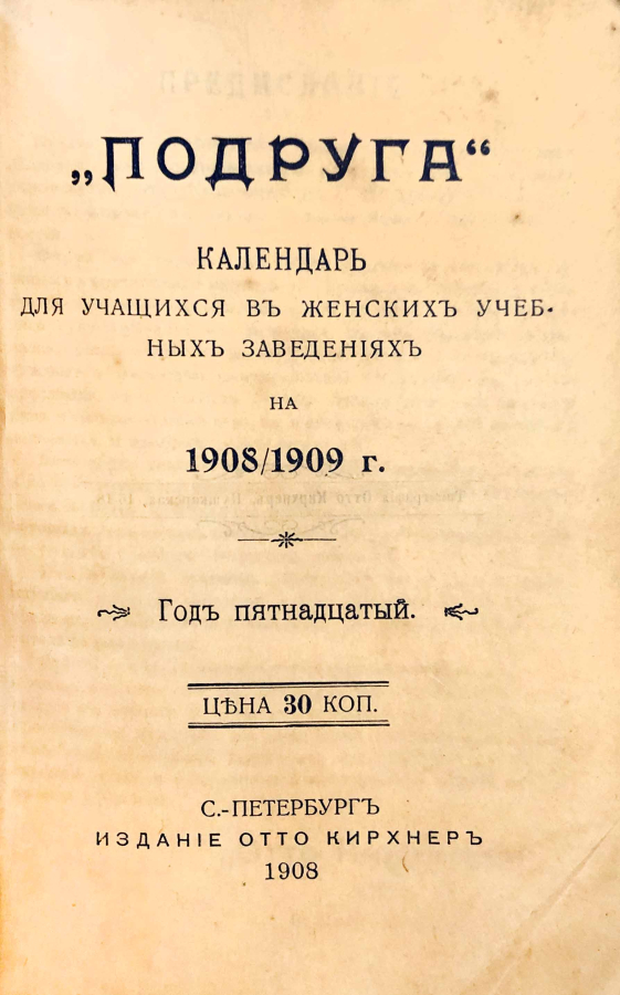 Календарь для учащихся в женских учебных заведениях на 1908-1909 учебный год. Немец Отто Кирхнер выпускал также и календари «Товарищ», он выпускался позднее в СССР. Календари под названием «Подруга» в СССР не печатались. Он первым в Российской Империи выпустил карманные записные книжки-календари, а по сути еженедельник со справочным материалом, именно с таким названием. Последний тираж был произведён в 1917-м г. на 1917/18 уч. год.