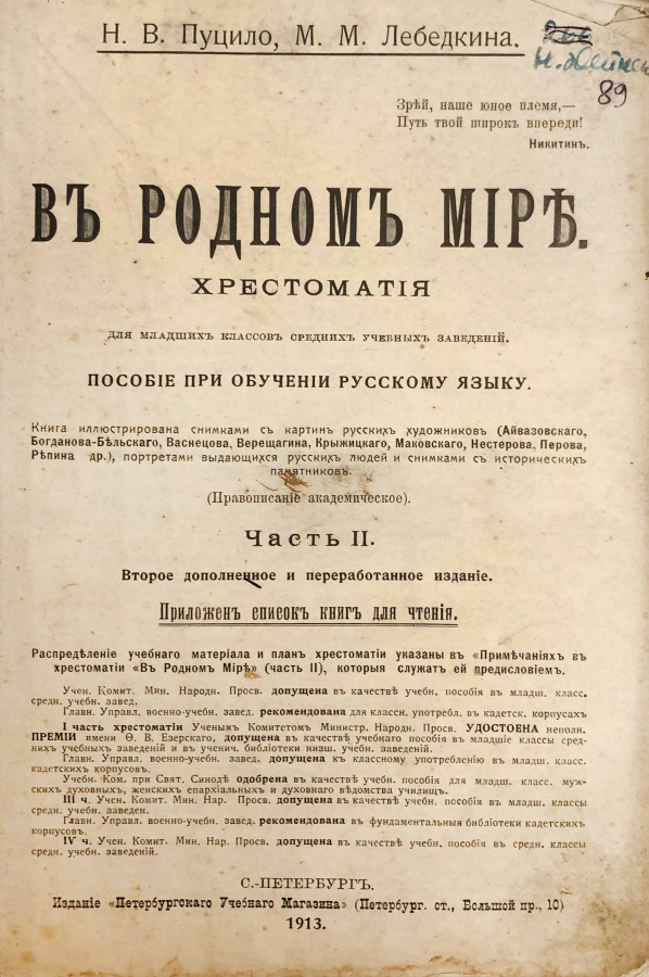 Хрестоматия для младших классов средних учебных заведений. Книга предназначена для обучения русскому языку и включает в себя разнообразные тексты, которые помогают развивать навыки чтения, письма и понимания языка. В хрестоматии представлены отрывки из произведений русских писателей, а также исторические и литературные материалы, которые способствуют воспитанию патриотизма и любви к родному языку. Иллюстрации в книге помогают лучше понять содержание текстов и делают процесс обучения более увлекательным.