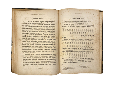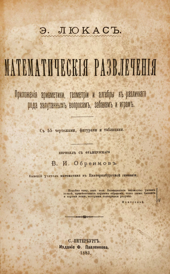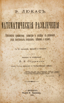 Учебник представляет собой сборник увлекательных задач и головоломок, демонстрирующих применение арифметики, геометрии и алгебры в играх и развлечениях. Перевод с французского сделал В. И. Обреимов, бывший учитель математики в Екатеринбургской гимназии. Учебник с 55 чертежами, фигурами и таблицами.