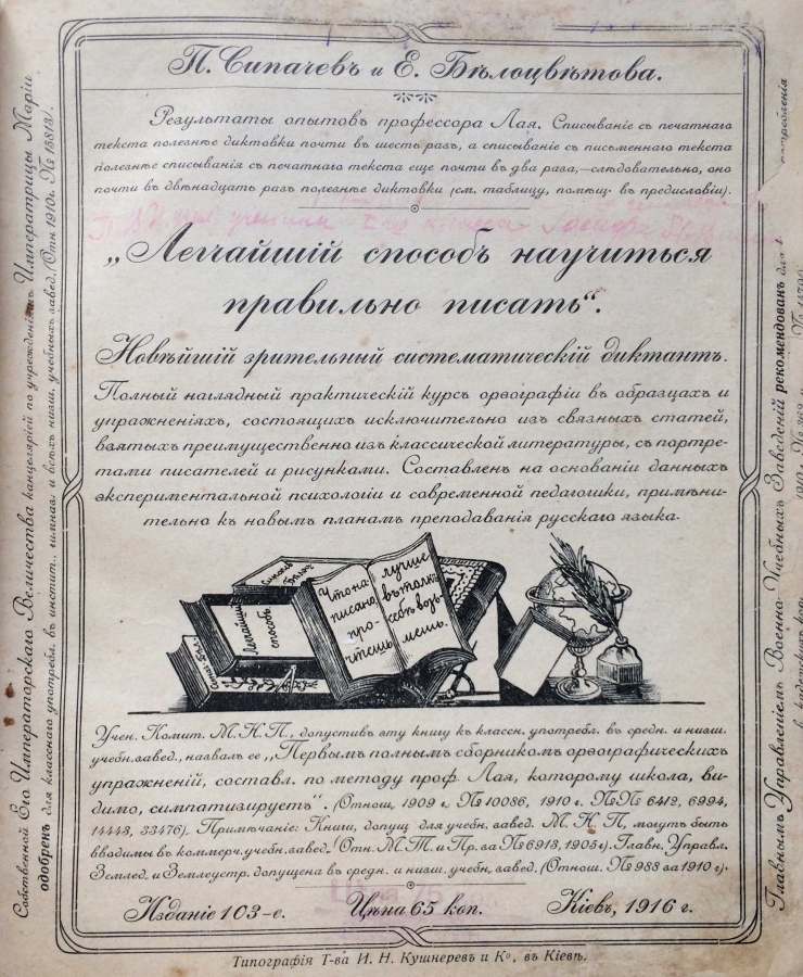 Новейший зрительный систематический диктант. Полный практический курс орфографии в образах и упражнениях, состоящих исключительно из связных статей, взятых преимущественно из классической литературы. с портретами писателей и рисунками. Книга составлена на основании данных экспериментальной психологии и современной педагогики Составили П. Сипачев и Е. Белоцветова. Книга представляет историческую и культурную ценность!