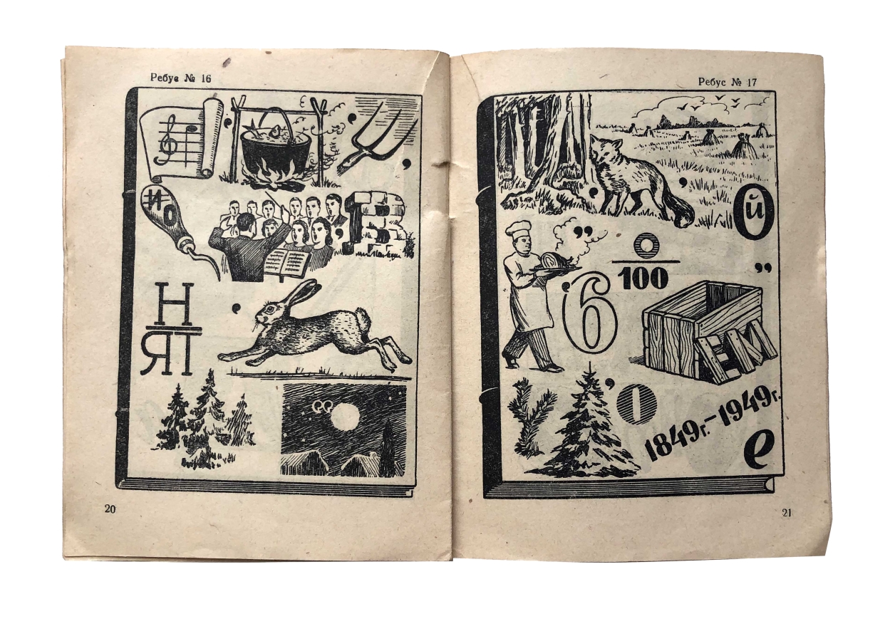 Книга с ребусами для детей. Читателю даётся слово или фраза, зашифрованная в виде последовательности рисунков, букв, слогов или чисел. Чёрно-белые рисунки. Помимо развлекательной функции ребусы несут в себе немалую пользу для интеллектуального развития. Они расширяют кругозор ребенка, увеличивают словарный запас, тренируют логику, мышление и интуицию. Книга представляет историческую и культурную ценность!