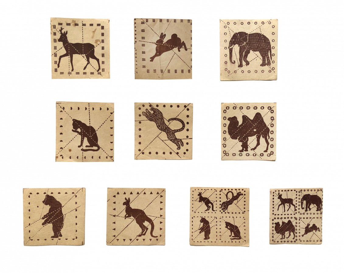 Десять листов с изображениями разных животных. Ребенку нужно разрезать изображения по линии и складывать как пазл.