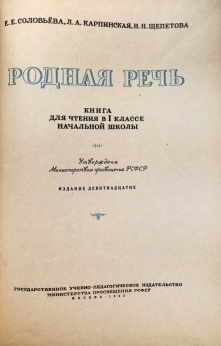 Прекрасный образец учебника советской эпохи. Книга для чтения в I классе начальной школы. Данное издание представляет собой сборник произведений русских писателей. В этой книге несколько разделов с разными темами: Школа, Семья, Зима, Советская армия, Город, Домашние и дикие животные. Учебник призван познакомить ученика с природой, устройством быта и окружающего общества, правилами гигиены и самоорганизации, коллективными ценностями и гордостью за СССР.