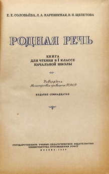 Прекрасный образец учебника советской эпохи. Книга для чтения в I классе начальной школы. Данное издание представляет собой сборник произведений русских писателей. В этой книге несколько разделов с разными темами: Школа, Семья, Зима, Советская армия, Город, Домашние и дикие животные. Учебник призван познакомить ученика с природой, устройством быта и окружающего общества, правилами гигиены и самоорганизации, коллективными ценностями и гордостью за СССР.