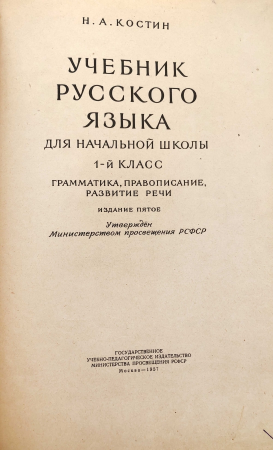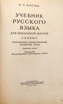 Учебник русского языка для первого класса начальной школы советской эпохи. Содержание учебника направлено на обучение детей грамматике, правописанию и развитию речи. Мы привыкли видеть в учебниках только методический потенциал, рассматривать их как обучающее средство. Однако в учебниках советской эпохи следует видеть также памятник языка научного и исторического значения. В нем отражается языковая картина мира народа в определенную эпоху.