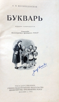 Букварь педагога и методиста по русскому языку А. И. Воскресенской. Букварь — это книга, которая первая давала советским детям образование, любовь к Родине, близким. Прекрасное пособие для обучения чтению ребёнка до школы. Очень хорошо построена методика порядка изучения букв, ребенок легко подключается к изучению чтения. Александра Ильинична Воскресенская — советский педагог и методист по русскому языку в начальной школе, автор букварей для сельских школьников. Член-корреспондент Академии педагогических наук РСФСР (1950), заслуженный учитель школы РСФСР.