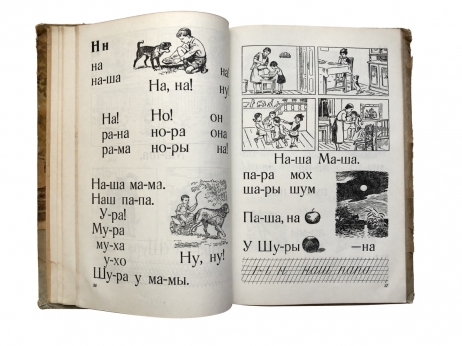 Черно-белые илл. Цветной иллюстрированный издательский картонаж. Есть потертости на переплете. Вложена разрезная азбука в отличном состоянии. Печати несуществующих библиотек.