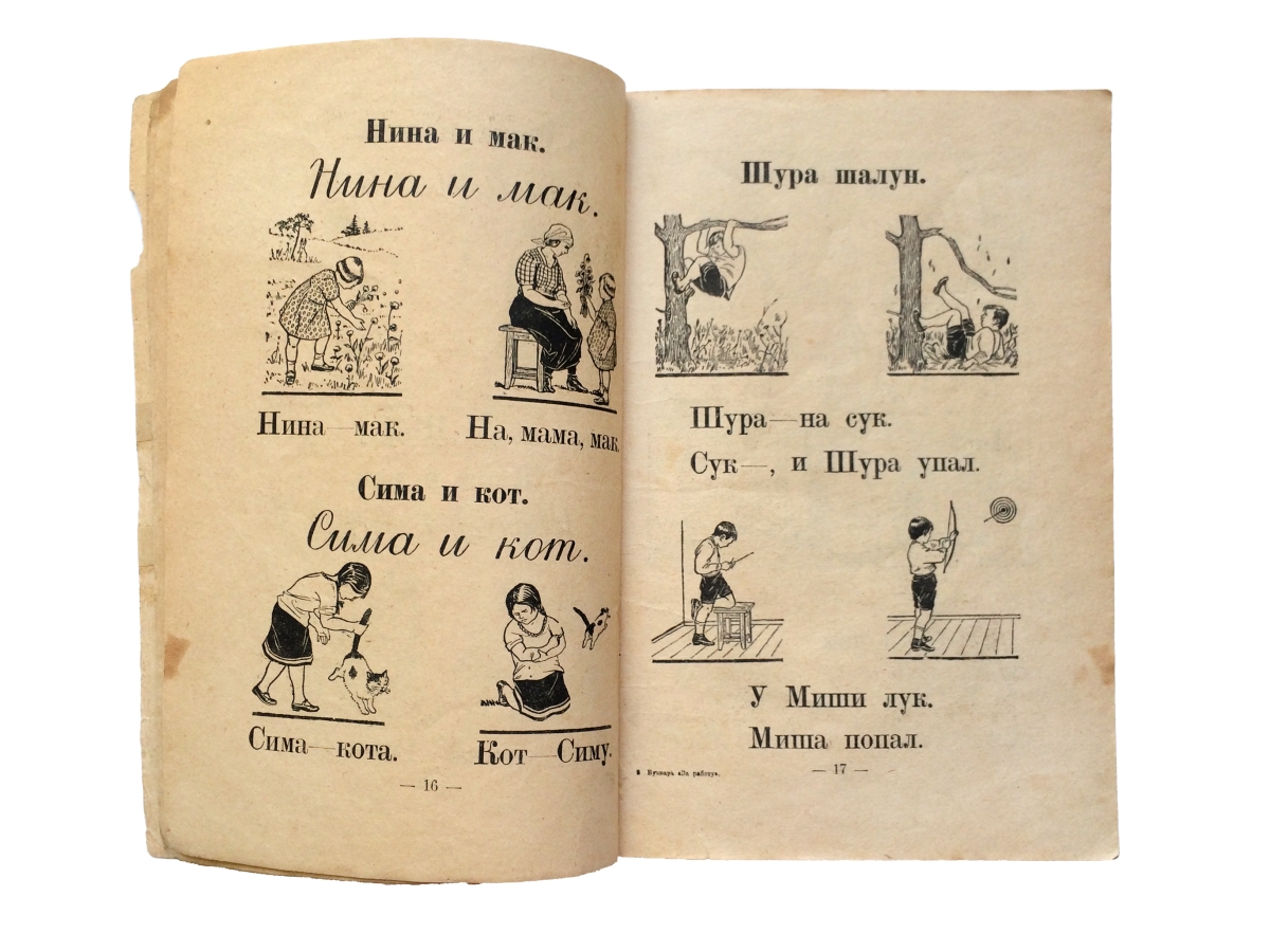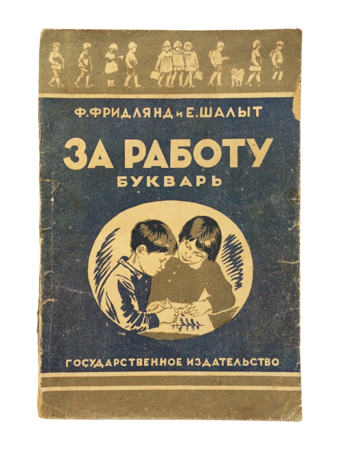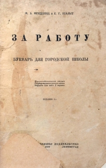 За работу — это букварь для городской школы. Букварь содержит алфавит, азбуку, прописи, чтение по слогам, много коротких рассказов, стишков, упражнения и задания — почти все сопровождается иллюстрациями. Книга представляет историческую и культурную ценность!