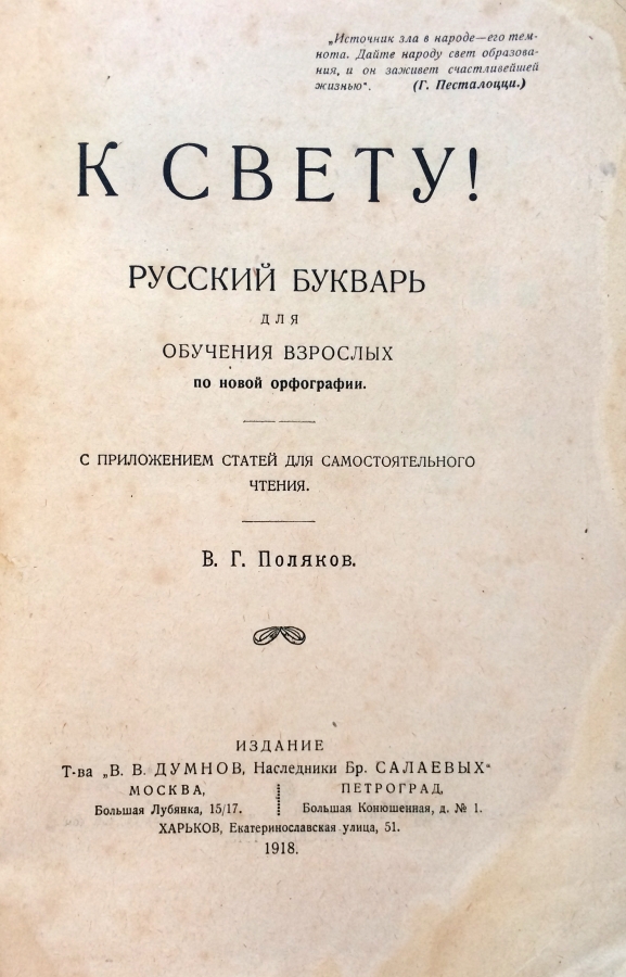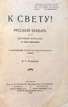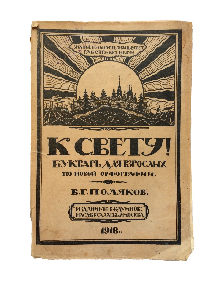 Книга для чтения "К свету " входит в серию учебников для взрослых. Книга на своем примере дает понять как на заре советской власти боролись с безграмотностью среди взрослого населения. Как была образована и получила развитие системы народного образования, бесплатного образования. В 1920 году Совет народных комиссаров принял декрет об учреждении Всероссийской чрезвычайной комиссии по ликвидации безграмотности (ВЧК ликбез), постановления которой имели обязательный характер. Всего в 1917 - 1927 годах было обучено грамоте до 10 млн взрослых, в том числе в РСФСР 5,5 млн. Книга представляет историческую и культурную ценность!