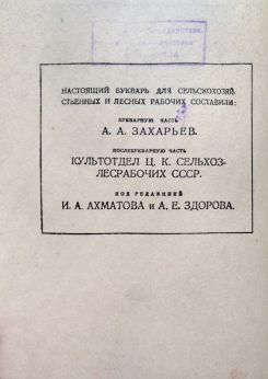 Составили: букварную часть А.А.Захарьев. Послебукварную часть Культотдел Ц.К. сельхозлесрабочих СССР. Под редакцией И.А.Ахматова и А.Е.Здорова.