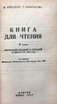 Книга для чтения на русском языке для 6 класса неполной средней и средней армянской школы. В книге собрано множество произведений русских классиков, сказок, рассказов и стихов. В тексте множество черно-белых иллюстраций. Будет интересна скорее как культурный памятник армянскому начальному образованию.