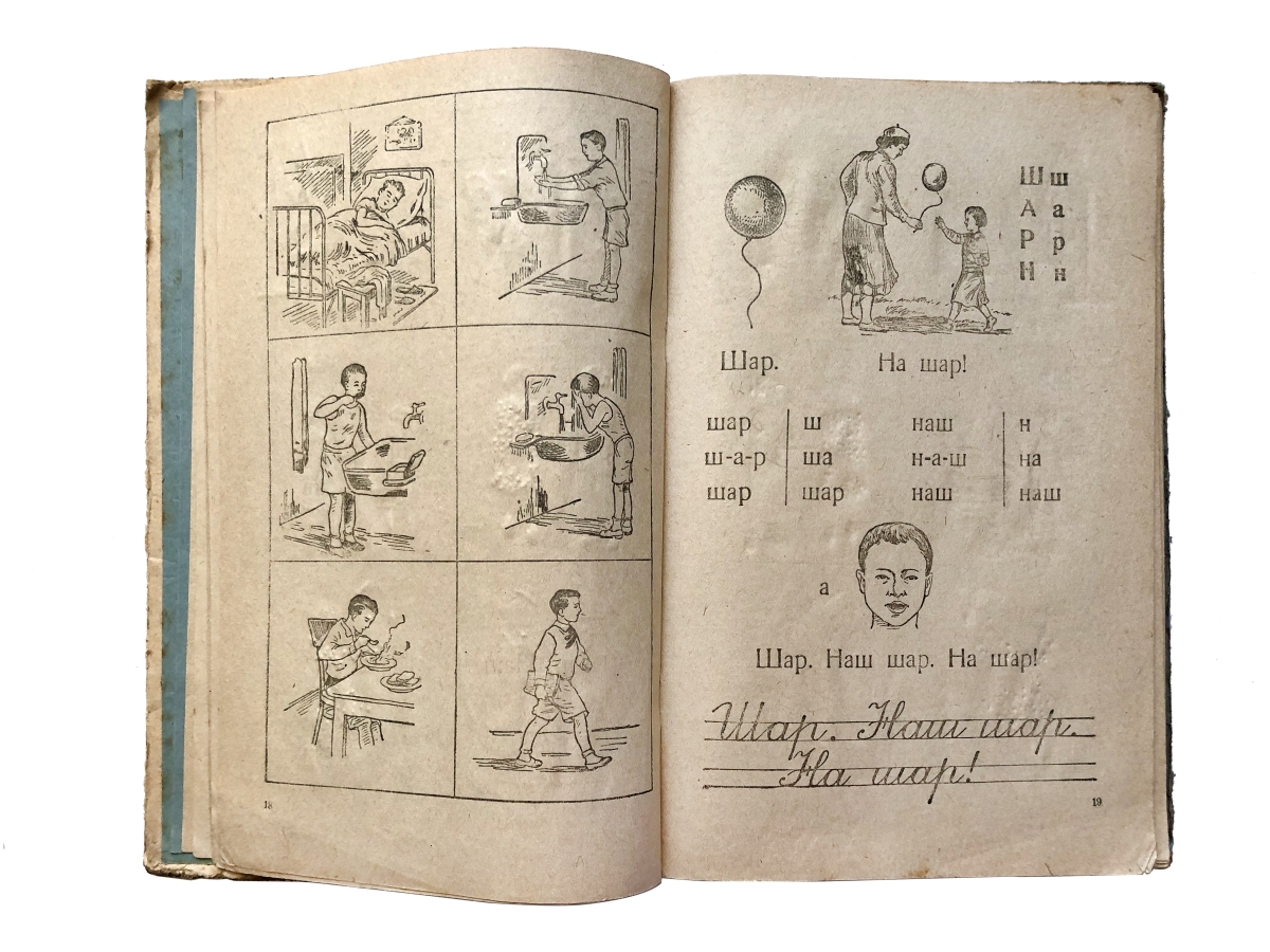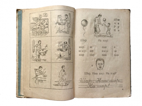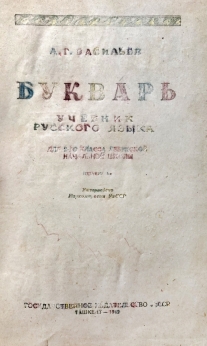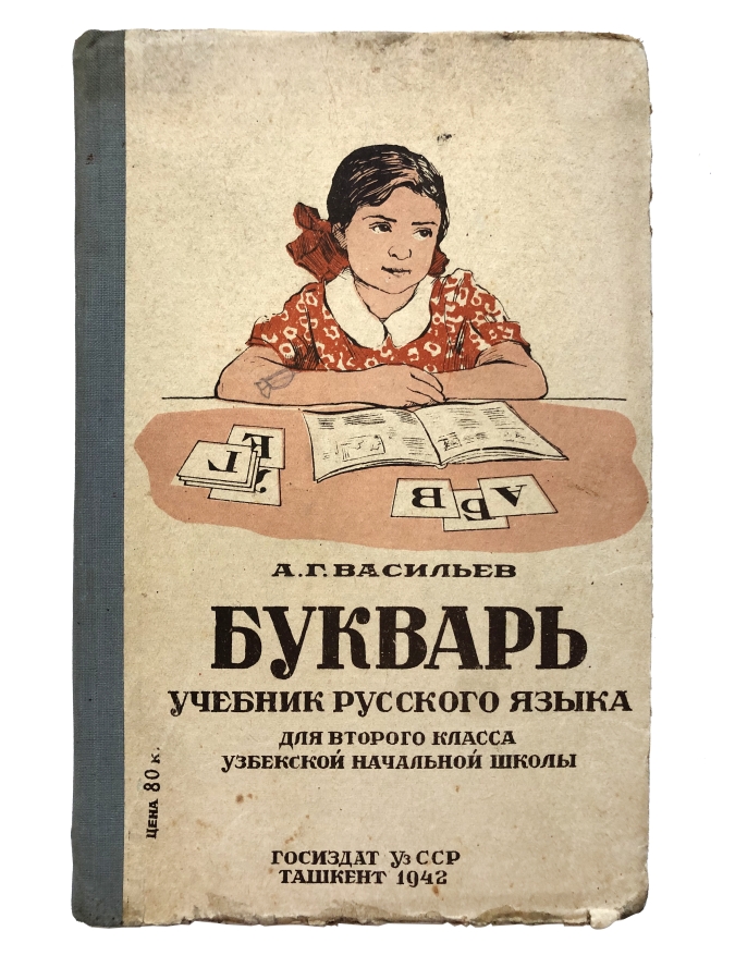 Учебник русского языка для второго класса узбекской начальной школы. На каждой странице букваря — иллюстрация, отражающая дух эпохи. Будет интересна скорее как культурный памятник узбекскому начальному образованию. Книга военного времени!
