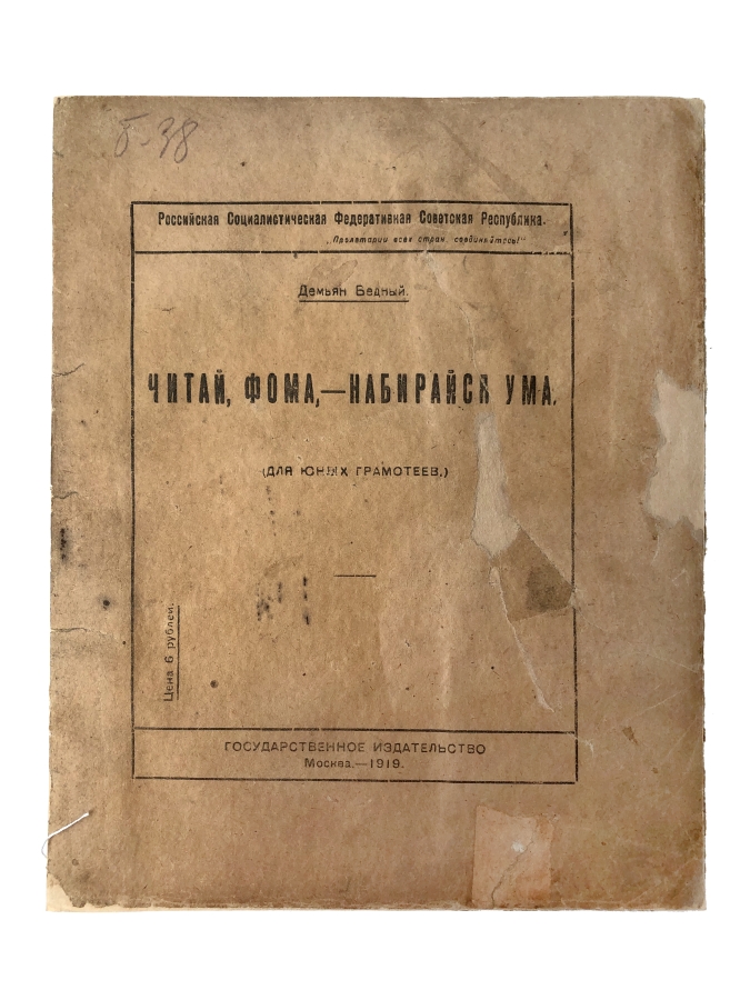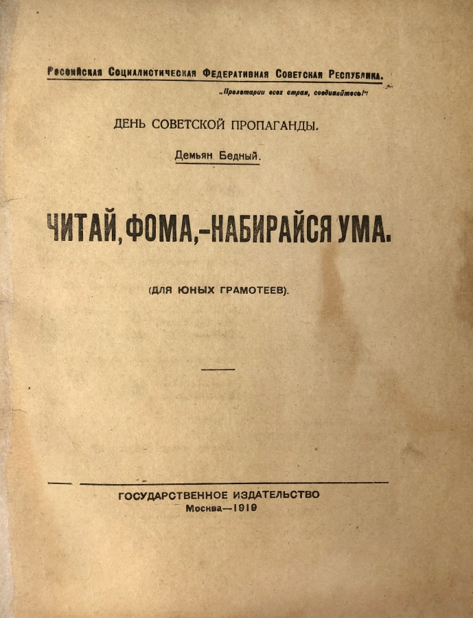 Книга стихов для детей Демьяна Бедного "Читай, Фома, набирайся ума" — о детстве до революции и о богатых возможностях детства при социализме. В стихотворении "У господ на елке" кухаркиному сыну "повезло" — он впервые в жизни попал на детский праздник, своими глазами увидел недоступное ему золотое детство власть имущих. В сборник также вошли стихотворения "Азбука", "Голь", "Муравьи", "Хозяин и батрак", "Опека", "Мокеев дар", "Сынок", "Свеча", "Благодетель" и др. Прижизненное издание!